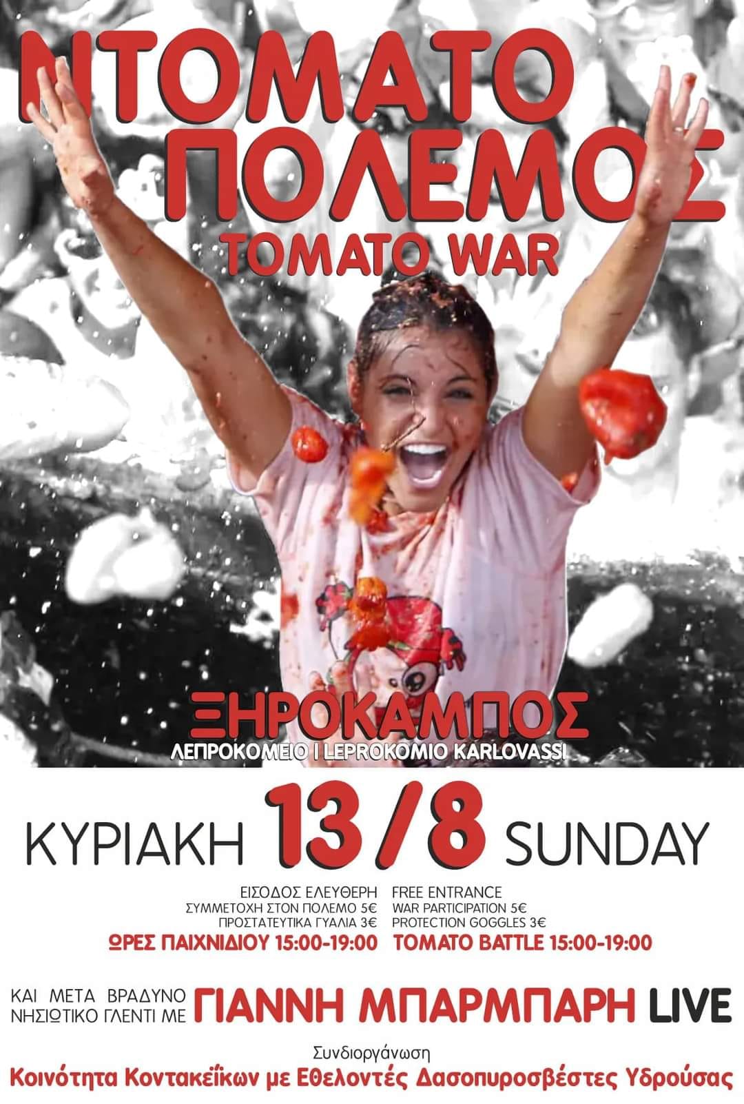 Ο πόλεμος της ντομάτας φέτος απο την κοινοτητα Κοντακαιίκων σε συνεργασία με τους εθελοντές δασοπροστασίας Υδρούσας, την Κυριακή 13 Αυγούστου στον Ξηρόκαμπο – Λεπροκομείο Καρλοβάσου