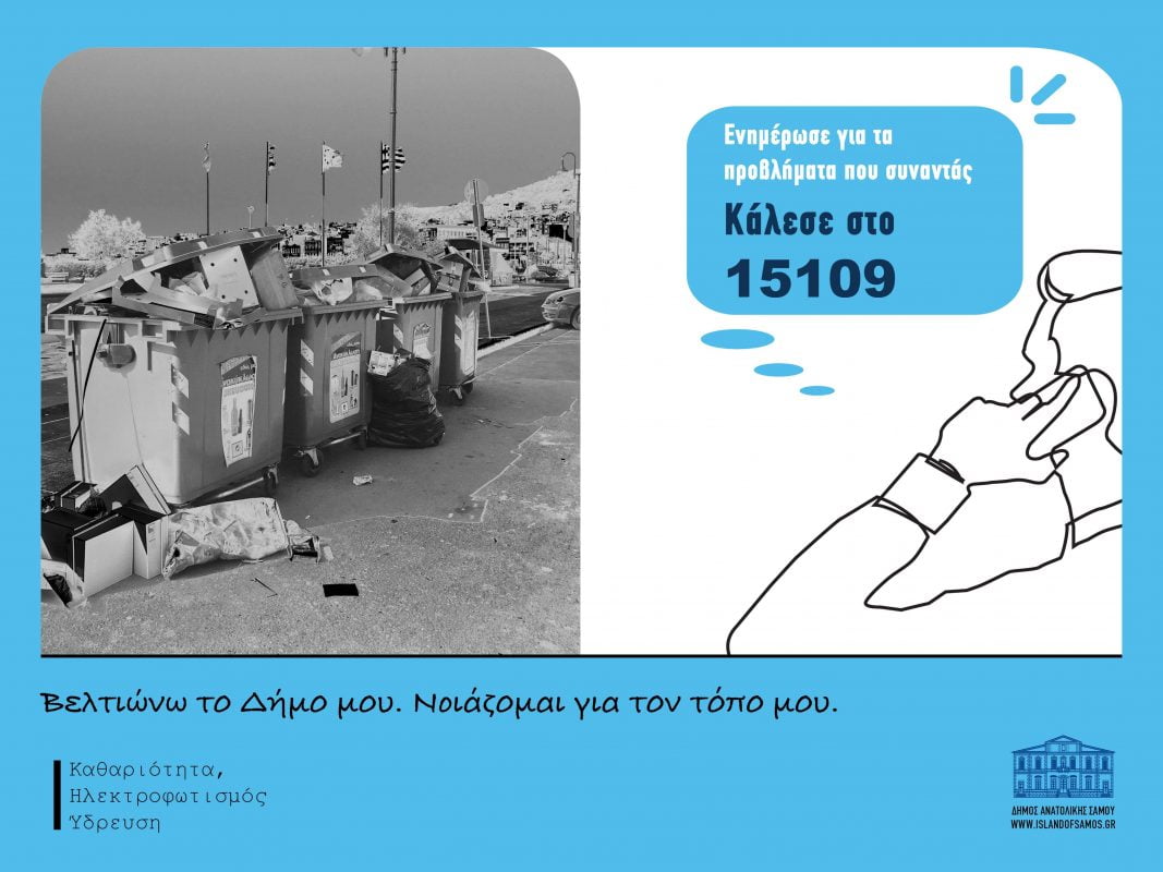 Στον 5ψηφιο αριθμό 15109, ο κάθε πολίτης μπορεί να επικοινωνεί απευθείας  24 ώρες το 24ωρο, προκειμένου να δηλώσει το πρόβλημά του. Το ειδικό πενταψήφιο σύστημα ειδοποίησης και καταγραφής του Δήμου Ανατολικής Σάμου αποτελεί ένα ουσιαστικά χρήσιμο εργαλείο αντιμετώπισης προβλημάτων τόσο για τη Δημοτική Αρχή, όσο και για τους ίδιους τους πολίτες.