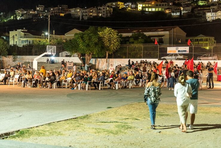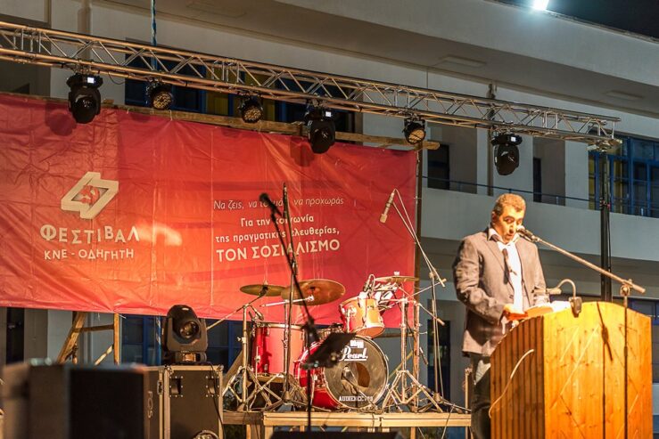 Ακολούθησε η πολιτική ομιλία από τον Βαγγέλη Μαρούπα, μέλος της Κ.Ε του ΚΚΕ, που ξεκίνησε τιμώντας τον μεγάλο μουσικοσυνθέτη Μίκη Θεοδωράκη, που με το έργο του «έπιασε το σφυγμό μιας εποχής που πλέον το καπιταλιστικό σύστημα έχει σαπίσει, δεν έχει να προσφέρει τίποτα παρά πολέμους, θάνατο, φτώχεια, ανεργία.»