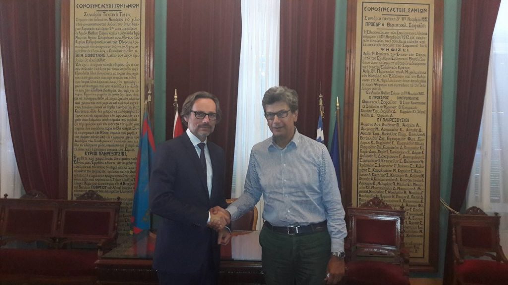 Εθιμοτυπική επίσκεψη του νέου Γερμανού Πρέσβη στην Ελλάδα κ. Γενς Πλάιντερ στο Δήμο Σάμου.Ο κ. Πλάιντερ ενημερώθηκε για τη συμμετοχή του Δήμου Σάμου στην Διεθνή Τουριστική Έκθεση στο Βερολίνο, καθώς επίσης και για τις υψηλές προσδοκίες που υπάρχουν από τη γερμανική αγορά για το 2018.