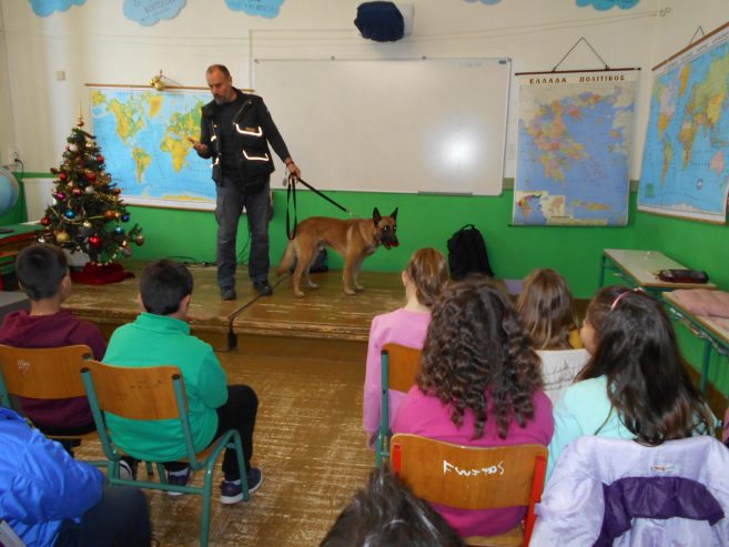Η παρουσίαση έγινε στη Ε΄και Στ΄ Τάξη και συνολικά παρακολούθησαν 23 παιδιά αυτό το μάθημα με μεγάλο ενδιαφέρον. Κεντρικό ρόλο έπαιξε και πάλι ο κ. Καζόγλου, που αυτήν την φορά ήρθε με τα δύο σκυλιά του. Όπως πάντα η παρουσίαση του ήταν καταπληκτική και άρεσε πολύ σε μαθητές και εκπαιδευτικούς. Τις εξηγήσεις του κ. Καζόγλου συμπλήρωσαν η νηπιαγωγός κ. Κέλλυ Μητσού, ο εκπαιδευτής σκύλων Νίκος Βαλσάμης και μέλη του σωματείου μας.