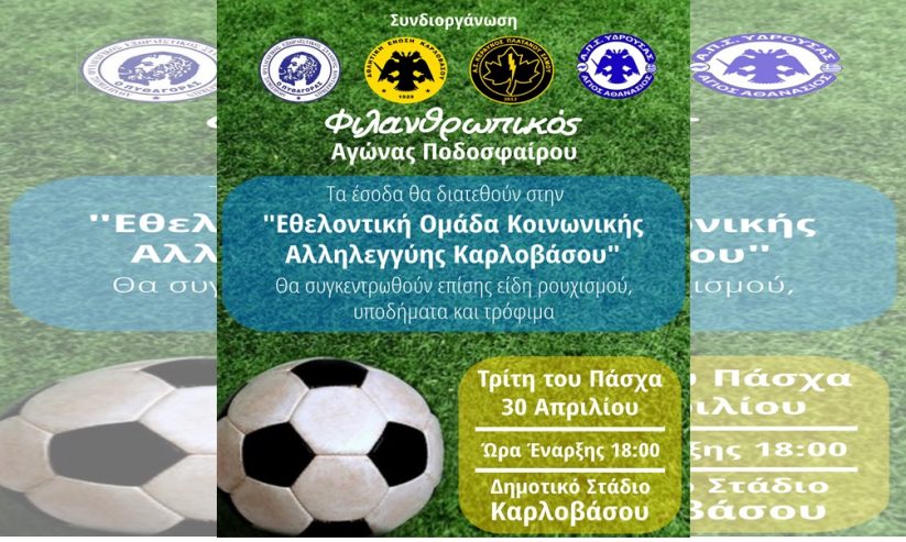 Τα ποδοσφαιρικά σωματεία Α.Ε. Καρλόβασι,Α.Π.Σ. Υδρούσσας “Άγιος Αθανάσιος”, Α.Σ Κεραυνός Πλατάνου και Α.Ψ.Ε.Σ. Πυθαγόρας Κοντακεϊκων συνδιοργανώνουν Φιλανθρωπικό Αγώνα Ποδοσφαίρου την Τρίτη του Πάσχα ,29 Απριλίου και ώρα 18:00 στο Δημοτικό Στάδιο Καρλοβάσου.
