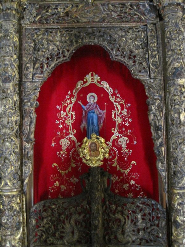 Οι δεσποτικές εικόνες που ευρίσκονται επ’ αυτού είναι παλαιότερες, θαυμάσιας τέχνης επίσης είναι τόσο ο ξυλόγλυπτος δεσποτικός θρόνος, ο οποίος είναι στραμμένος προς ανατολάς, όσο και τα δύο προσκυνητάρια, τα οποία φέρουν το ένα την εφέστιο εικόνα της Ζωοδόχου Πηγής, επενδεδυμένη με αργυρή διακόσμηση του 1793 και το άλλο την Μεγάλη Δέηση του 1819.