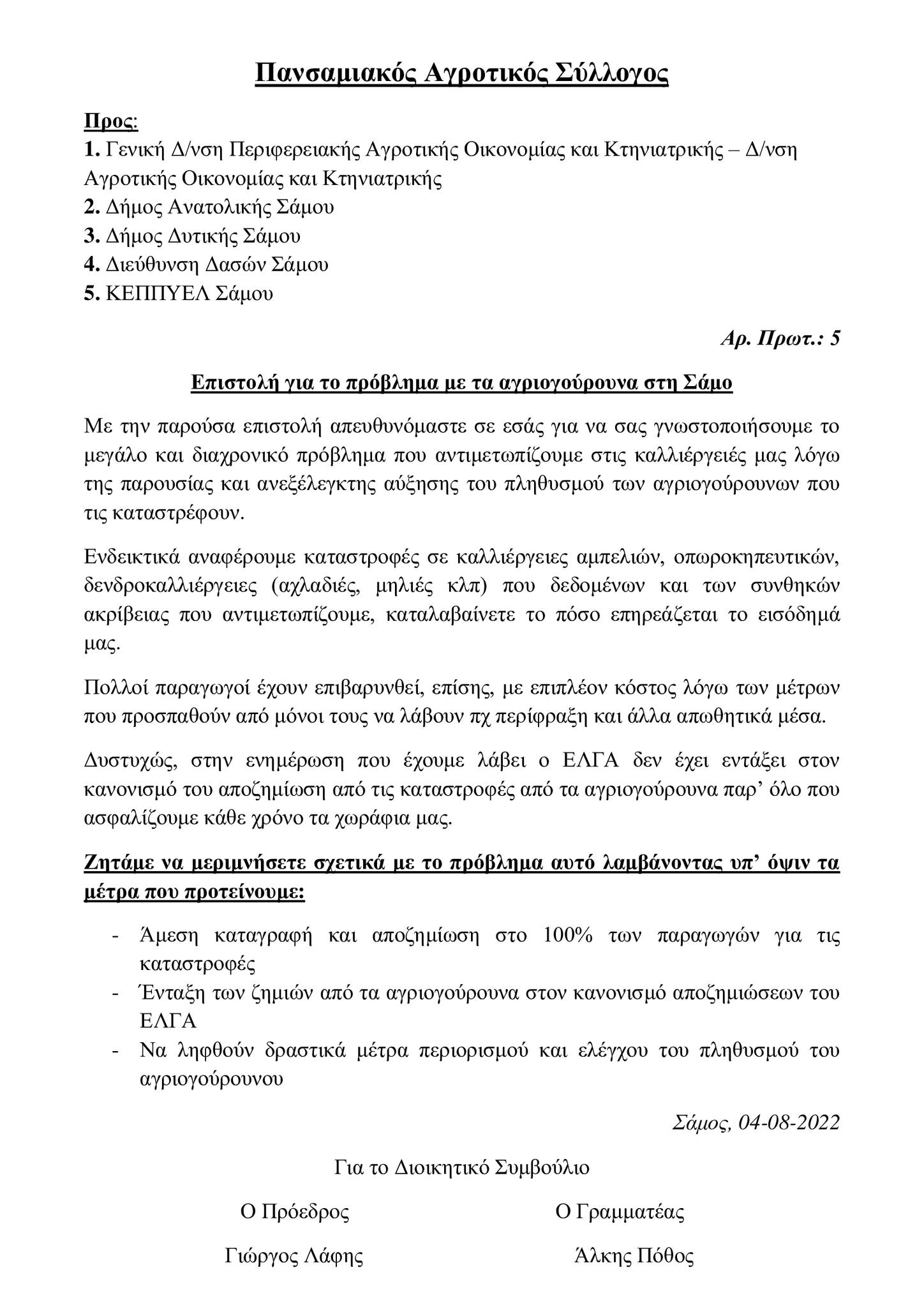 Καλοκαίρι του 2022 (βλ. πρώτο δελτίο τύπου 4/8/2022) ο Πανσαμιακός Αγροτικός Σύλλογος ξεκινά τις προσπάθειες απευθυνόμενος προς όλους τους αρμοδίους για την κατάσταση με τις καταστροφές των καλλιεργειών μας από τα αγριογούρουνα. Κάνει κάλεσμα για υπογραφές από τους πληττόμενους γεωργούς, συναντήσεις με την Περιφέρεια, την Δ/νση Γεωργίας, το Δασαρχείο, κυνηγετικούς συλλόγους και εκπροσώπους από το δήμο, συναντήσεις με τον ίδιο το βουλευτή…