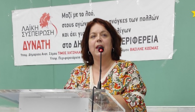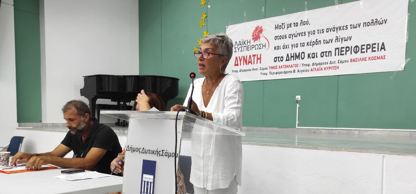Η Αγλαϊα Κυρίτση υποψήφια περιφερειάρχης Βορείου Αιγαίου, παίρνοντας το λόγο αναφέρθηκε στα πεπραγμένα της περιφερειακής αρχής Μουτζούρη και των άλλων παρατάξεων που όπως είπε εφαρμόζουν κατά γράμμα τις στρατηγικές επιλογές Ε.Ε και κυβερνήσεων, βάζοντας σε τελευταία προτεραιότητα τις λαϊκές ανάγκες των κατοίκων των νησιών μας. Η Λαϊκή Συσπείρωση  – τόνισε – από τη πρώτη στιγμή της τετραετίας που πέρασε έβαλε στο Συμβούλιο τα τεράστια προβλήματα στην υγεία, τη παιδεία, τα έργα πολιτικής προστασίας κ. ά διεκδικώντας λύσεις  και αναδεικνύοντας την πραγματική διάσταση των προβλημάτων , των αιτιών που τα προκαλούν και τη δυνατότητα τεχνική και οικονομική που υπάρχει σήμερα, από τον τεράστιο πλούτο που παράγει ο λαός,  να αντιμετωπιστούν άμεσα και ριζικά. Υπογράμμισε δε, ότι είναι η ώρα να κάνουμε το επόμενο βήμα με την ενίσχυση των ψηφοδελτίων της Λαϊκής Συσπείρωσης για την αλλαγή του αρνητικού συσχετισμού στα νησιά μας, για να ξημερώσει μια καινούργια μέρα δημιουργική για τον τόπο μας. Οι υποψήφιοι που στελεχώνουν το ψηφοδέλτιο της περιφερειακής Ενότητας Σάμου – υπογράμμισε – είναι δοκιμασμένοι αγωνιστές , βρίσκονται και θα βρεθούν και μετά τις  εκλογές στη πρώτη γραμμή των αγώνων που έχουμε μπροστά μας.