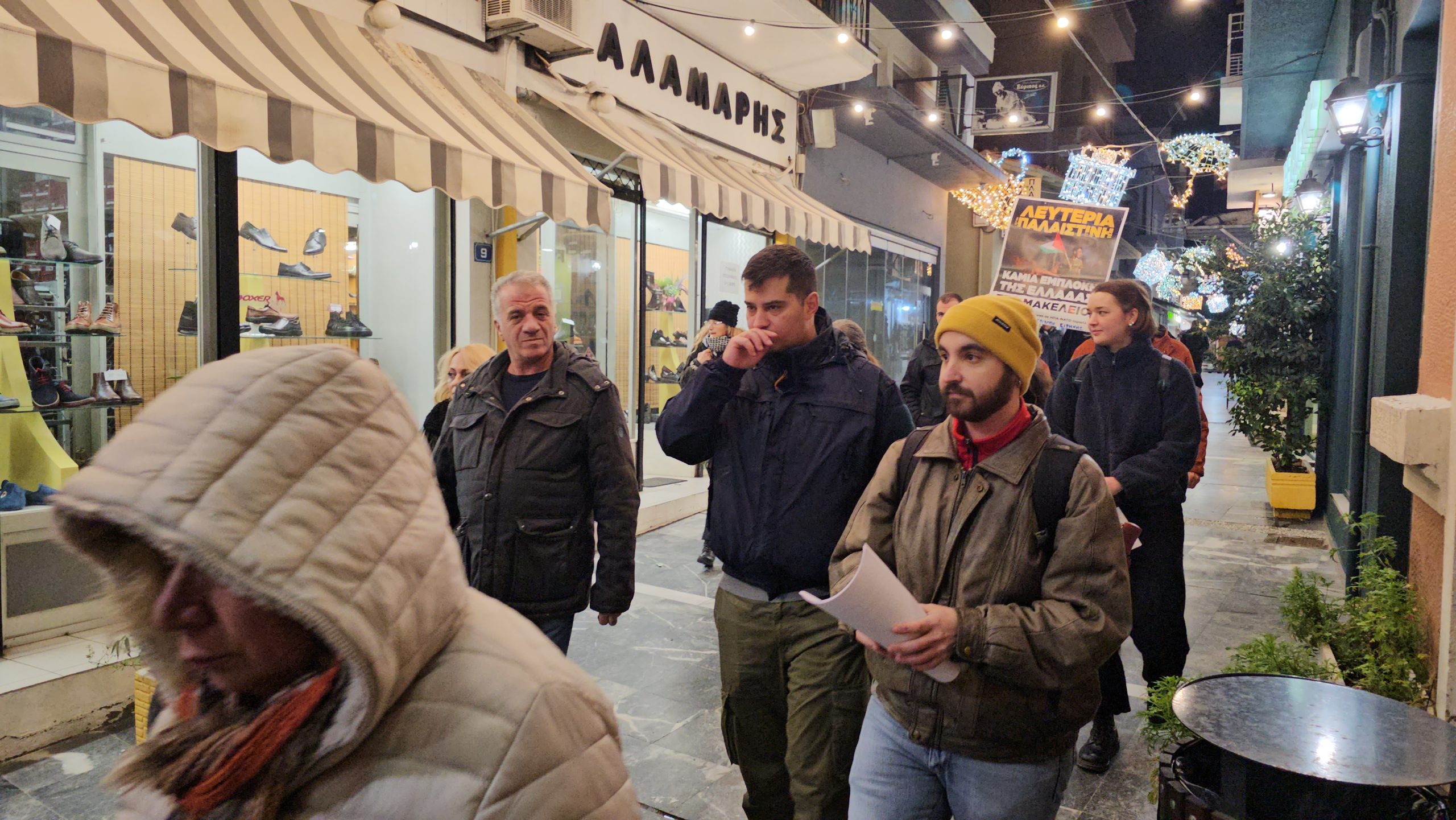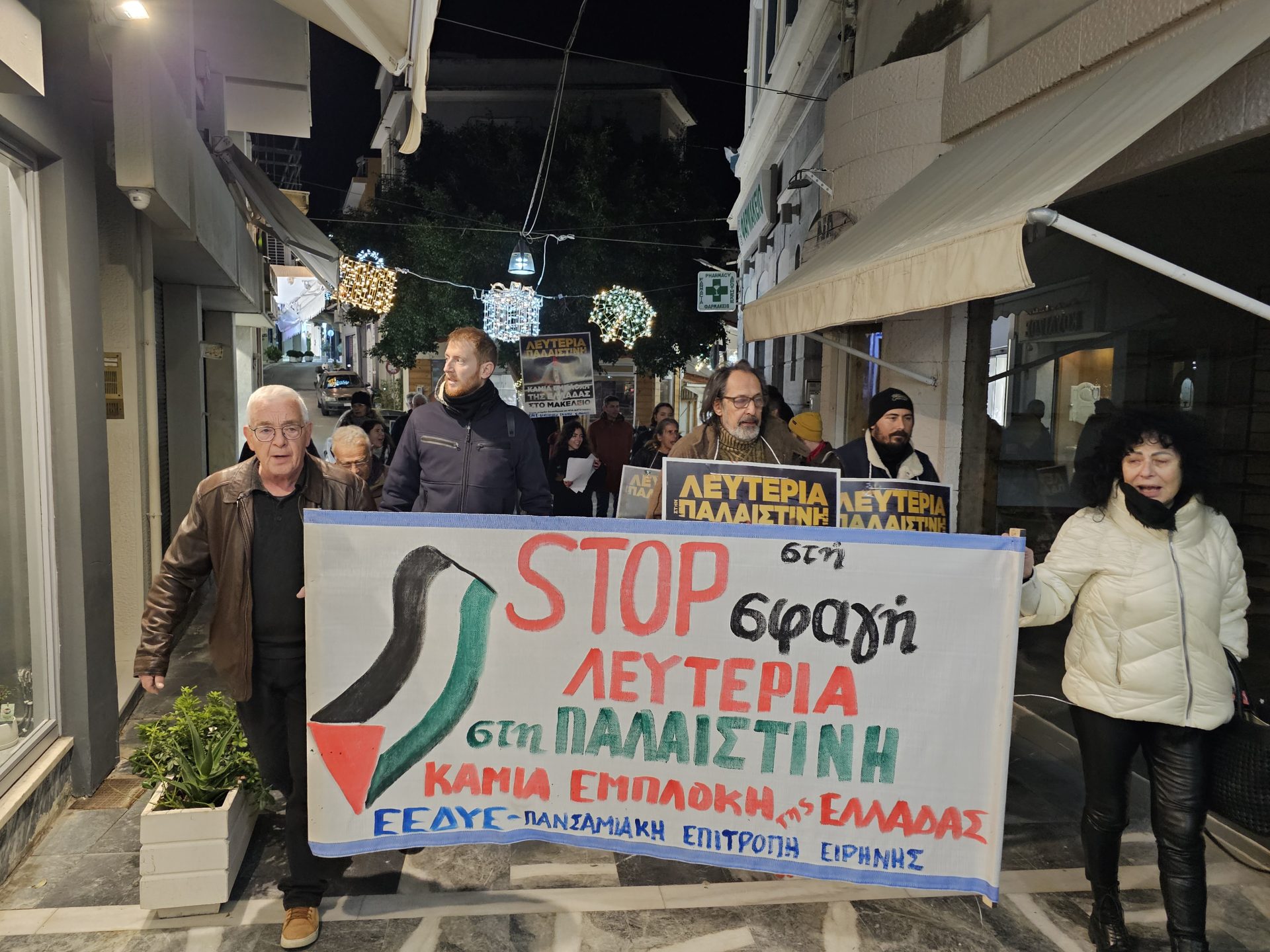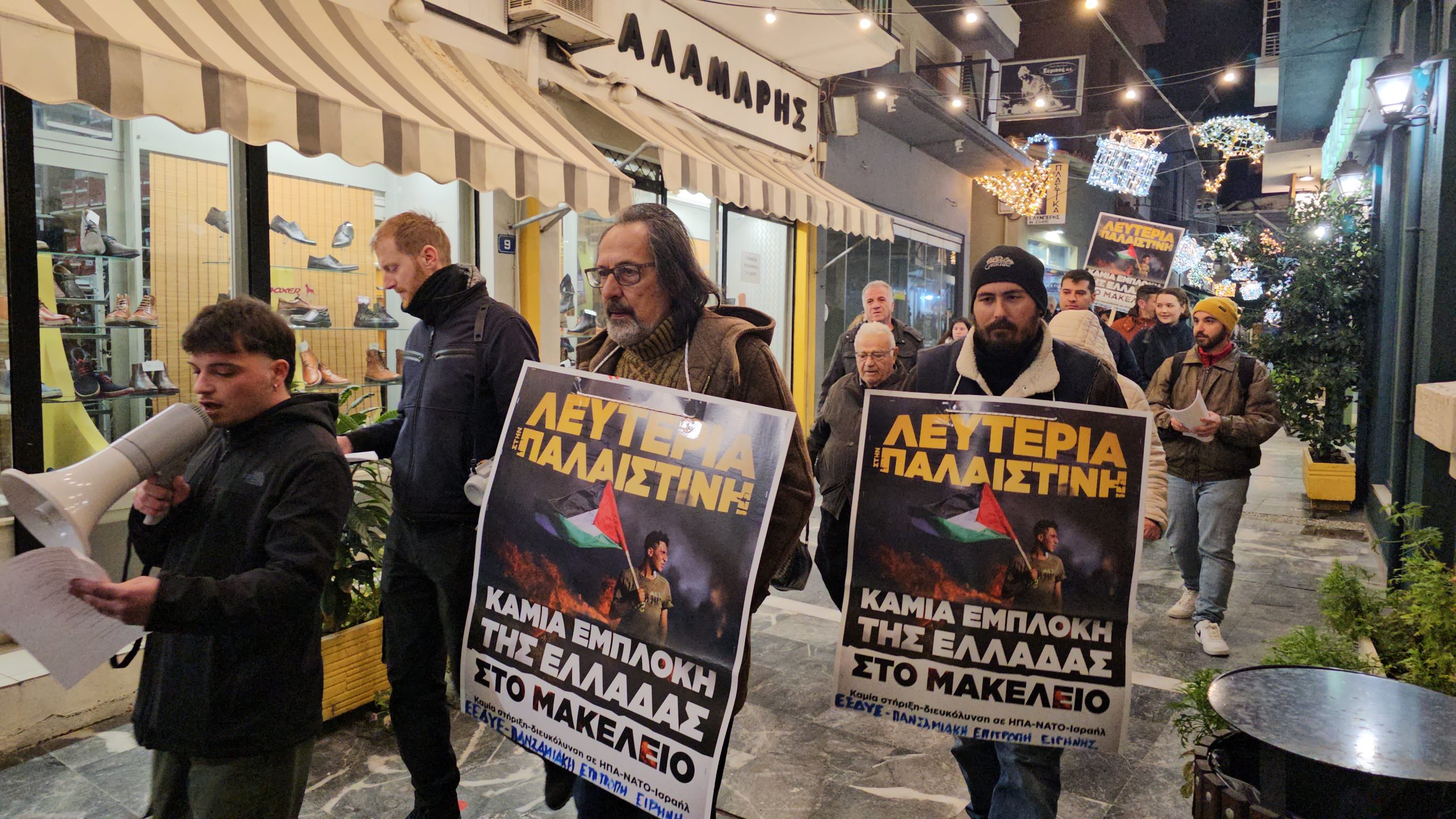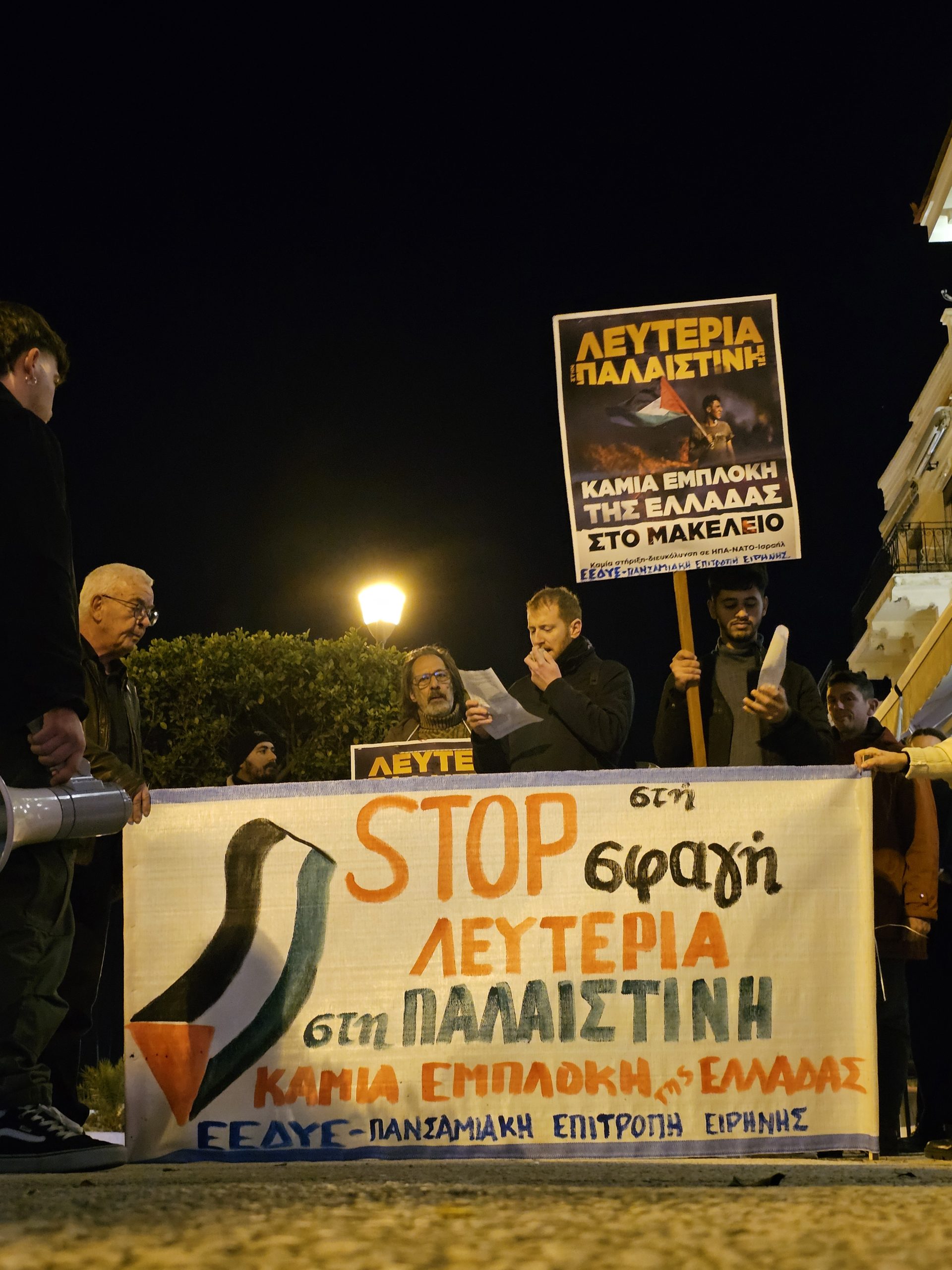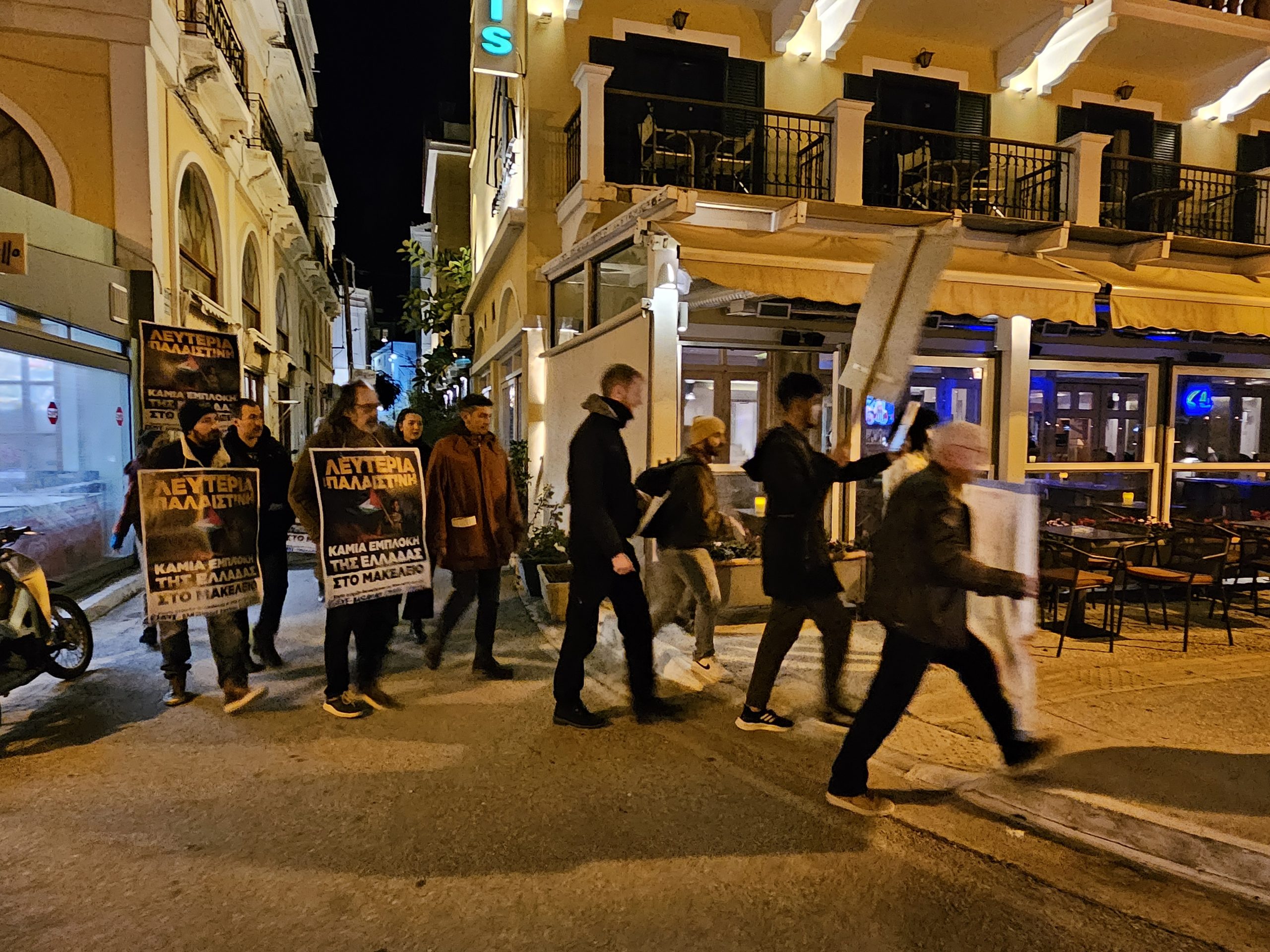 Με συνθήματα «Λευτεριά στη Παλαιστίνη», «Καμία εμπλοκή καμιά συμμετοχή -έξω το ΝΑΤΟ κι οι Αμερικανοί», «Κλείστε τις βάσεις – φέρτε και τα πλοία, καμιά συμμετοχή στου ΝΑΤΟ τα σφαγεία» , «Η ιστορία έχει μια σωστή πλευρά, με τη Παλαιστίνη ως τη Λευτεριά», «Το έγκλημα αυτό έχει υπογραφή- ΝΑΤΟ, ΕΕ και Αμερικανοί» κ.ά, οι διαδηλωτές ενημέρωσαν τον κόσμο και μοίρασαν ανακοινώσεις.