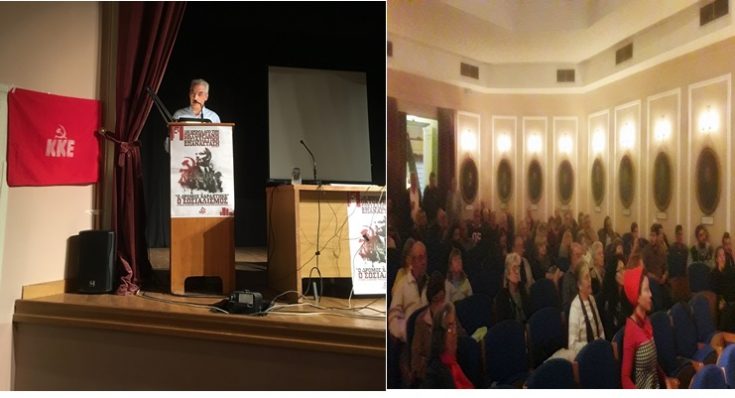 Η εκδήλωση ξεκίνησε με την προβολή βίντεο για την Οκτωβριανή Επανάσταση . Ακολούθησε η κεντρική ομιλία από τον Παναγιώτη Μεντρέκα, μέλος της Γραμματείας της ΚΕ.