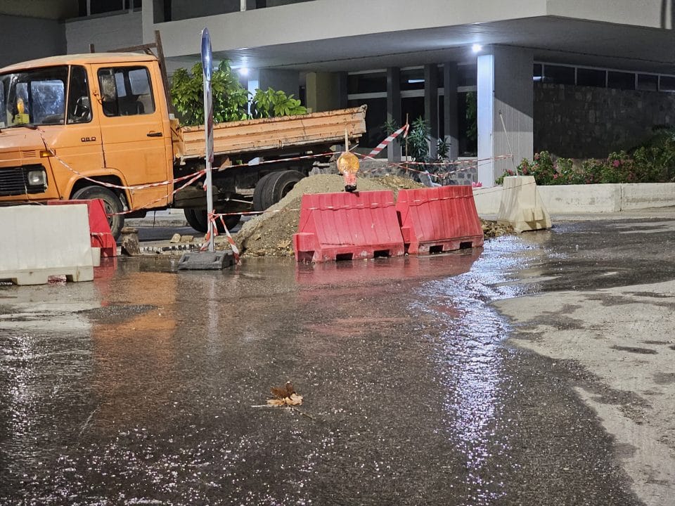 Σαν να μην έφτανε η πολύωρη διακοπή υδροδότησης, νωρίς το απόγευμα από το παλαιό υφιστάμενο δίκτυο το νερό άρχισε να αναβλύζει μέσα από την άσφαλτο και χύνεται στο δρόμο