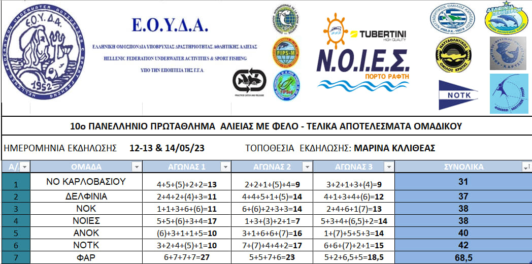 Μετά την ολοκλήρωση του Πανελλήνιου, Πρωταθλητής σύλλογος για το 2023 ανακηρύχθηκε ο Ναυταθλητικός Όμιλος Καρλοβάσου με 31 βαθμούς και πήρε το εισιτήριο για εκπροσωπήσει την χώρα ως σύλλογος στο Πανευρωπαϊκό Πρωτάθλημα στην Ιταλία τον Σεπτέμβρη του 2023.