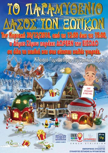 Ο Δήμος Σάμου σας προσκαλεί στην πρωτοχρονιάτικη εορταστική εκδήλωση που θα πραγματοποιηθεί την Κυριακή 30 Δεκεμβρίου και ώρα 12.00 έως 15.00, στο «Δάσος των Ξωτικών».