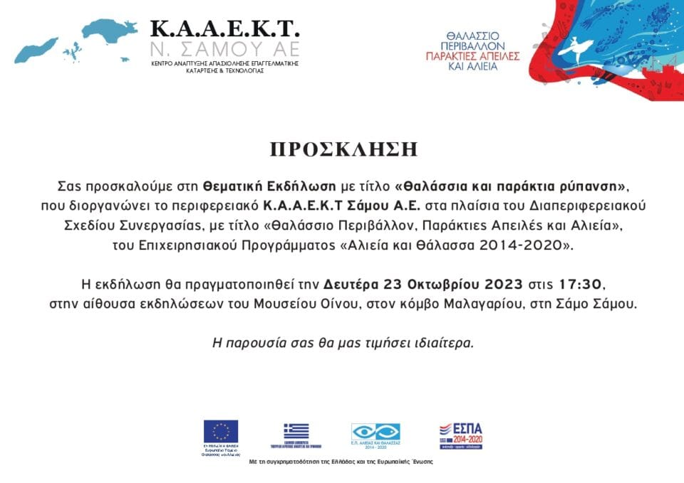 Το KAAEKT Σάμου διοργανώνει την Δευτέρα 23 Οκτωβρίου 2023, στις 17:30 στο Μουσείο Οίνου της Σάμου, την 5η Θεματική – Ενημερωτική Εκδήλωση με τίτλο «ΘΑΛΑΣΣΙΑ & ΠΑΡΑΚΤΙΑ ΡΥΠΑΝΣΗ»