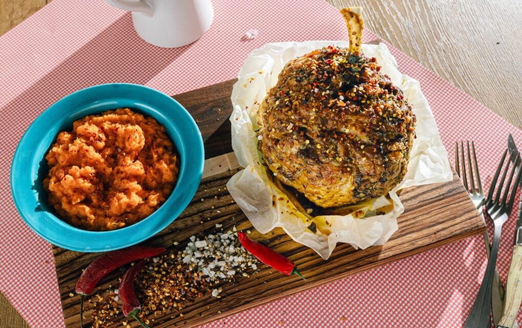 Βγάζουμε το κότσι από το φούρνο και σερβίρουμε με πουρέ.