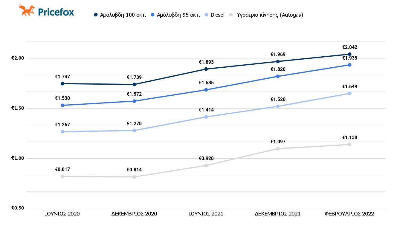 Σύμφωνα με τα στοιχεία του Υπουργείου ανάπτυξης και Ανταγωνιστικότητας, φαίνεται πως το 2020 οι τιμές της απλής βενζίνης άγγιζαν το 1,572€/λίτρο. Μέσα στο πρώτο εξάμηνο του 2021 οι τιμές έφτασαν στο 1,685€/λίτρο, ενώ η χρονιά έκλεισε με τους οδηγούς να πληρώνουν για απλή αμόλυβδη 1,820€/λίτρο. Η έκρηξη τιμών ήρθε τον Φεβρουάριο του 2022 με τους οδηγούς να έρχονται αντιμέτωποι στα πρατήρια καυσίμων με τιμές που εκτοξεύτηκαν στο 1,935€/λίτρο.