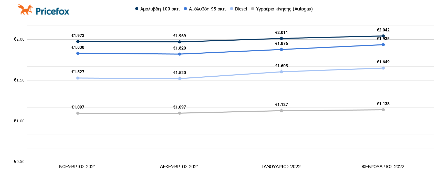 Συνεχίζεται το Ράλι τιμών με την τιμή στην απλή αμόλυβδη να φτάνει από 1,830€/λίτρο στο 1,935€/λίτρο ενώ παράλληλα η ενισχυμένη βενζίνη να ξεπερνάει τα 2€/λίτρο μέσα στον Φεβρουάριο. Η μέση τιμή για τους οδηγούς πετρελαιοκίνητων αγγίζει το 1,649€/λίτρο από 1,527€/λίτρο που ήταν το Νοέμβριο. Η μεγαλύτερη έκπληξη είναι οι τιμές του υγραερίου που  έφτασε στο 1,138€/λίτρο.