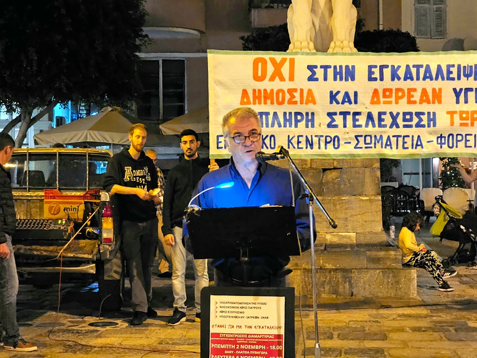 Τελευταίος ακολούθησε ο Σταμάτης Φιλιππής, πρόεδρος του ΔΣ του συλλόγου Εργαζομένων Γ. Νοσοκομείου Σάμου και μέλος της εκτελεστικής γραμματείας του ΝΤ Σάμου της ΑΔΕΔΥ, όπου δήλωσε πως ο σύλλογος εργαζομένων αντιστέκεται στην αποψίλωση του δημόσιου συστήματος υγείας στην χώρα μας και ότι λέει όχι στο νόμο για το νέο ΕΣΥ που παύει ουσιαστικά τους ιατρούς να είναι πλήρους αποκλειστικής απασχόλησης στο δημόσιο σύστημα υγείας. Επίσης τόνισε την αντίθεση τους στο νοσοκομείο επιχείρηση, των ιδιωτικοποιήσεων και των συγχωνεύσεων τα οποία είναι κύριοι παράγοντες για την εντατικοποίηση και την εξουθένωση των υγειονομικών που είτε την τουριστική σεζόν η σε περιόδους πανδημίας η αύξηση του αριθμού προσφύγων-μεταναστών το προσωπικό του νοσοκομείου όχι δεν μόνο δεν αυξάνεται αλλά αντιθέτως συνεχώς μειώνεται.