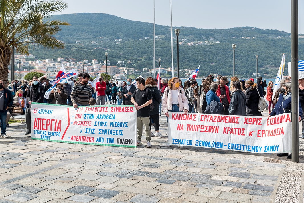 Συνέχισαν με δυναμική πορεία στην παραλιακή, ενώ συνθήματα όπως «Συμβάσεις κλαδικές – αυξήσεις των μισθών, αυτή είναι η απαίτηση των εργατών» αλλά και «ΗΠΑ και Ρωσία τη Γη ξαναμοιράζουν, με των λαών το αίμα τα σύνορα χαράζουν» γέμιζαν την πόλη. Η πορεία των διαδηλωτών κατέληξε στην πλατεία Πυθαγόρα. Με χαιρετισμό ξεκίνησε η πρόεδρος της Πανσαμιακής Επιτροπής Ειρήνης και μέλος του Εθνικού Συμβουλίου της ΕΕΔΥΕ Ρούλα Στεφανάκη, η οποία αναφέρθηκε στο βάθεμα της εμπλοκής της χώρας μας στους ιμπεριαλιστικούς σχεδιασμούς με την Ελλάδα να έχει γίνει μια απέραντη βάση. Στη συνέχεια, χαιρετισμό έκανε ο Χρήστος Πανούσος, μέλος του ΝΤ Σάμου της ΑΔΕΔΥ, ο οποίος ανέδειξε την αξία συσπείρωσης στα σωματεία σε κάθε κλάδο και στο χώρο του Δημοσίου που θα συμβάλει στην άνοδο της διεκδίκησης των αιτημάτων.