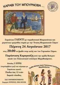 Η Ένωση Μικρασιατών Σάμου σας προσκαλεί στο Σαμιώτικο γλέντι με παραδοσιακά και ρεμπέτικα τραγούδια την Πέμπτη 24 Αυγούστου 2017 στις 20.00 το βράδυ στη πόλη της Σάμου στην αυλή του 1ου Γυμνασίου . Με σαντούρι, πολίτικη λύρα ,ούτι, λαούτο ,μπαγλαμά , μπουζούκι, ακορντεόν, παραδοσιακά κρουστά και όμορφα τραγούδια από νέους μουσικούς της Σάμου που θα μας ξεσηκώσουν με κέφι και διάθεση . Κρασάκι και μεζέ για όλους! Θα δοθεί παράσταση Καραγκιόζη για τους μικρούς μας φίλους από την Ομάδα Θεάτρου Σκιών Πολιτιστικού συλλόγου Μαραθοκάμπου.