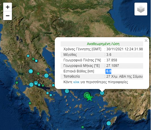 Σεισμική δόνηση μεγέθους 3,6 βαθμών της κλίμακας Ρίχτερ σημειώθηκε το μεσημέρι της Τρίτης, στις 14.24,  σε απόσταση 27χλμ. ανατολικά βορειοανατολικά της Σάμου . Το εστιακό βάθος του σεισμού υπολογίζεται 6,8 χιλ.