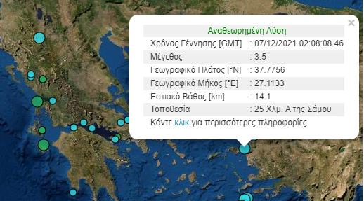 Σεισμός 3,5 βαθμών της κλίμακας Ρίχτερ σημειώθηκε στη Σάμο στις 04:08 τα ξημερωματα της Τρίτης, στον θαλάσσιο χώρο 25 χιλιόμετρα ανατολικά του νησιού.