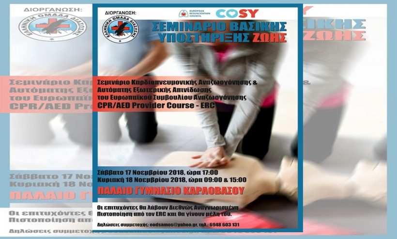 Tο Παράρτημα Σάμου της Ελληνικής Ομάδας Διάσωσης, σε συνεργασία με το Ευρωπαϊκό Συμβούλιο Αναζωογόνησης ERC, διοργανώνουν πλήρη και πιστοποιημένη εκπαίδευση Πρώτων Βοηθειών – Βασική Υποστήριξη της Ζωής.