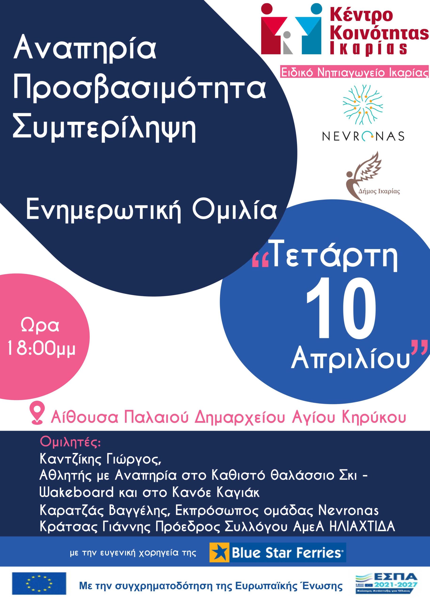 Το Κέντρο Κοινότητας Ικαρίας και το Ειδικό Νηπιαγωγείο Ικαρίας σας προσκαλούν στις ενημερωτικές ομιλίες σχετικά με την αναπηρία, την προσβασιμότητα και την συμπερίληψη.