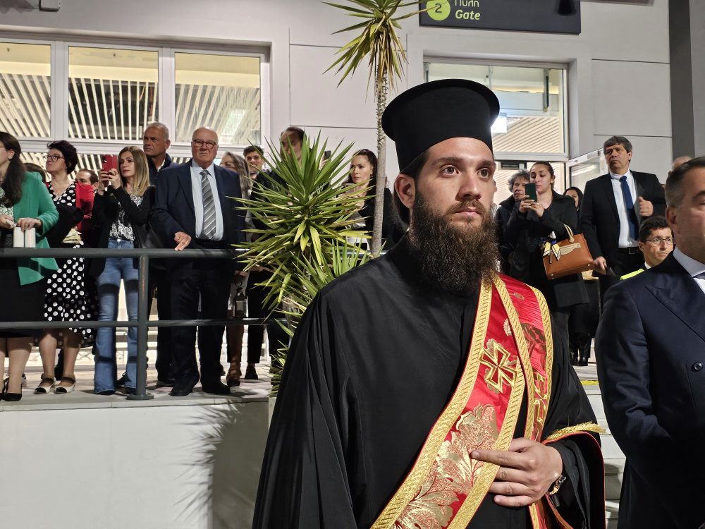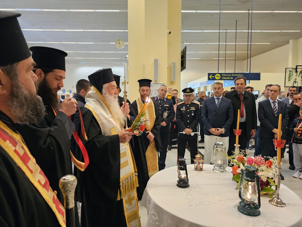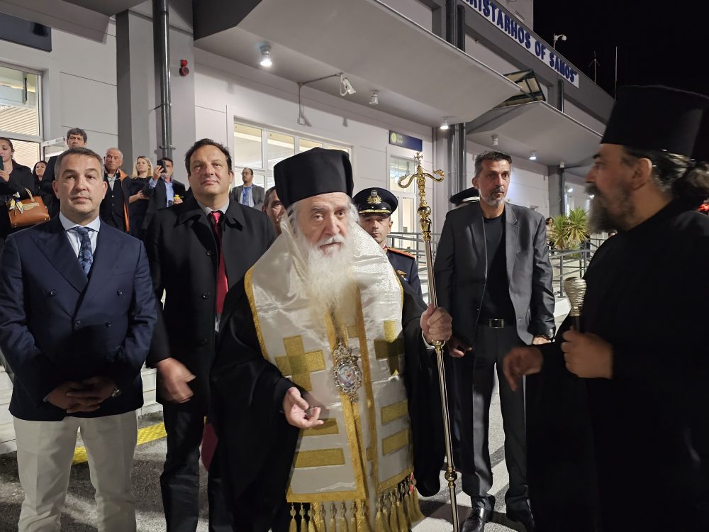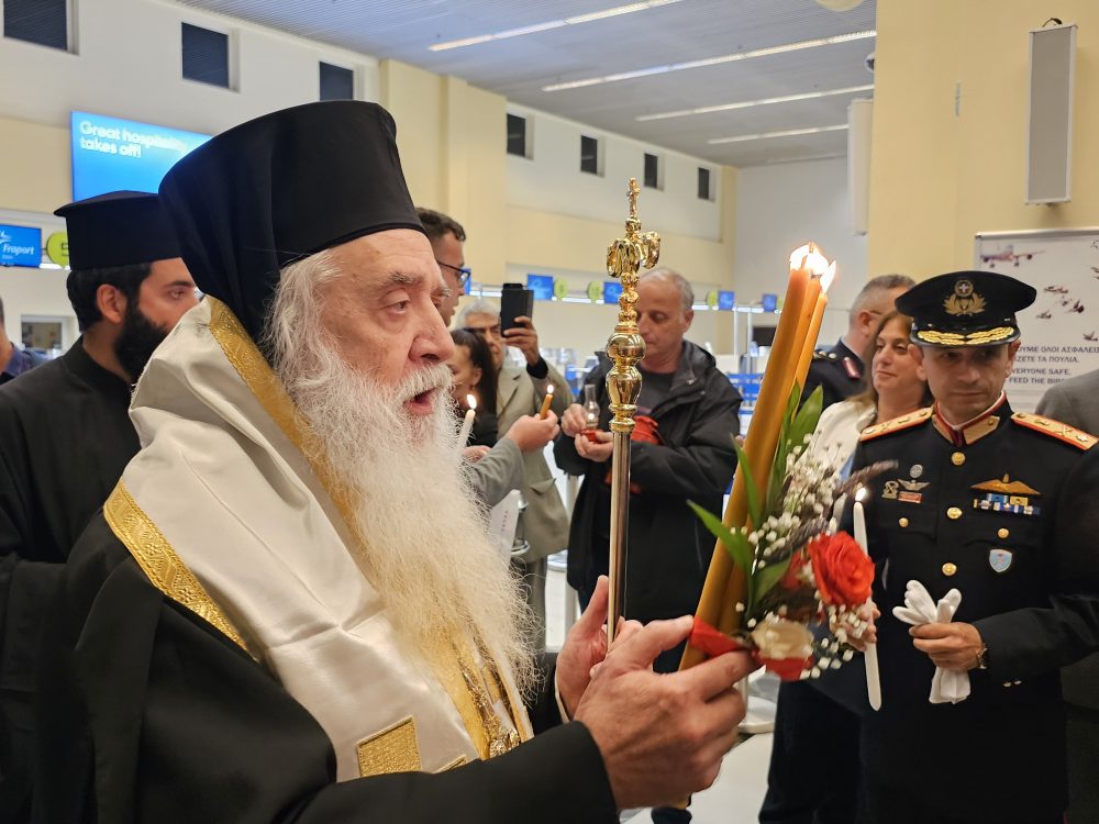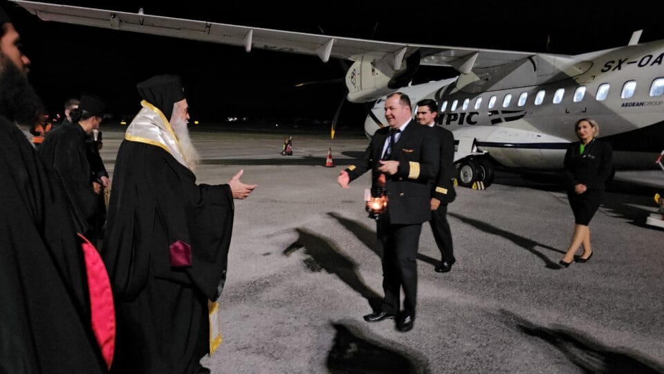 Ο Σεβασμιώτατος Μητροπολίτης Σάμου και Ικαρίας κ.κ. Ευσέβιος παρέλαβε το Άγιο Φως από τον κυβερνήτη του αεροσκάφους, ενώ τιμές απέδωσε τιμητικό άγημα της 79 ΑΔΤΕ.