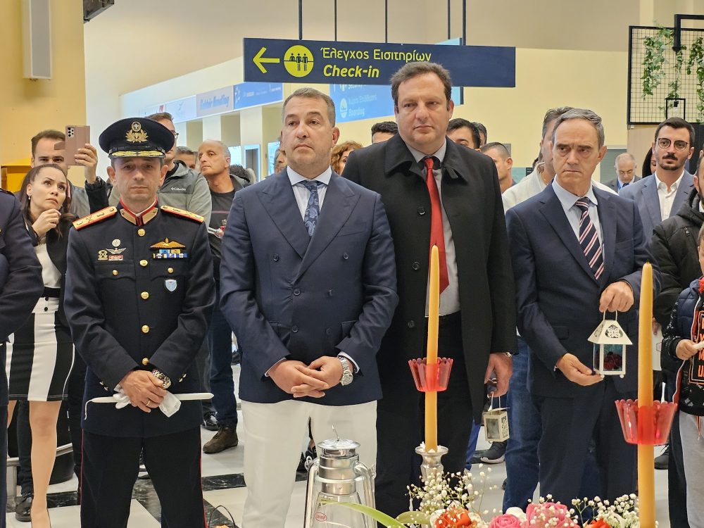Στην αίθουσα του αεροδρομίου τελέστηκε δέηση από τον Μητροπολίτη παρουσία αρχών, ιερέων και πιστών. Στη συνέχεια, το Άγιο Φως διανεμήθηκε σε κληρικούς και λαϊκούς με φαναράκια και λαμπάδες, για να μεταφερθεί σε κάθε γωνιά του νησιού και με ταχύπλοο σκάφος του Λιμενικού Σώματος στα κοντινά νησιά.