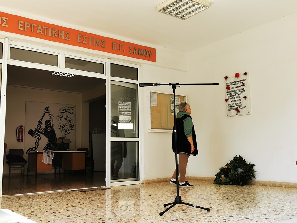 Οι εκδηλώσεις στη Σάμο ξεκίνησαν από τον προαύλιο χώρο του ΕΚΣ, όπου έγινε κατάθεση στεφανιών και λουλουδιών στην τιμητική πλάκα για τους εκτελεσμένους Σαμιώτες και Ικαριώτες στο Σκοπευτήριο της Καισαριανής την 1η Μάη 1944, από εκπροσώπους του ΕΚΣ, του ΝΤ Σάμου της ΑΔΕΔΥ, της Επιτροπής Ειρήνης Σάμου, της Προοδευτικής Κίνησης Γυναικών Σάμου και του παραρτήματος Σάμου της ΠΕΑΕΑ.