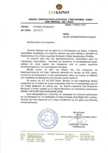 Ο Ενιαίος Οινοποιητικός Αγροτικός Συνεταιρισμός Σάμου (ΕΟΣΣ), απέστειλε συγχαρητήριο προς τη Λέσχη Αρχιμαγείρων Ελλάδος εκφράζοντας ευχαριστήρια για τη διαρκή συνεργασία αλλά και για την επάξια βράβευση του Σαμιώτη executive chef Ευάγγελου Μπιλιμπά. Διαβάστε παρακάτω το κείμενο της συγχαρητήριας επιστολής .