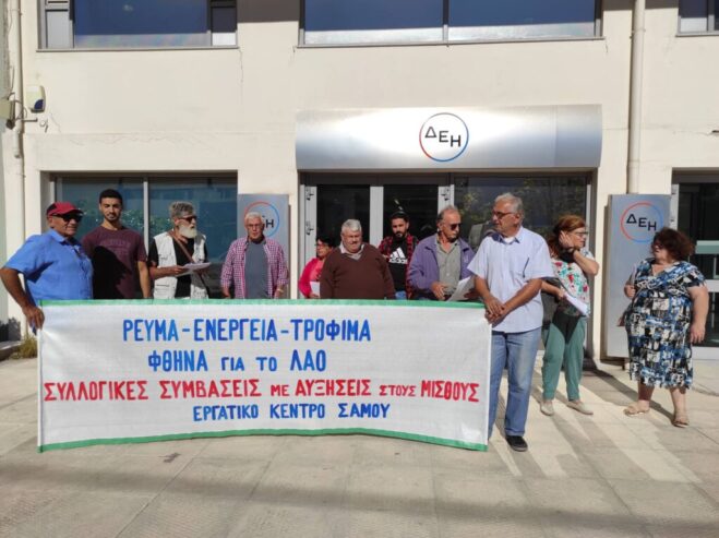 Σε συμβολικές παρεμβάσεις σε ΔΕΗ, σούπερ μάρκετ και στο κέντρο του Βαθιού στη Σάμο προχώρησαν μέλη του Εργατικού Κέντρου Σάμου και των σωματείων με σχετική ανακοίνωση ώστε να διεκδικήσουν φθηνό ρεύμα και τρόφιμα για το λαό.