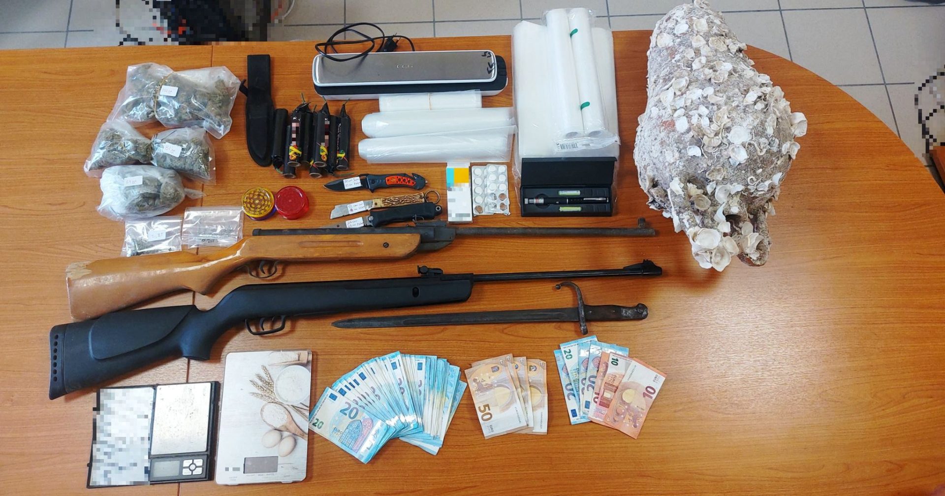 Επιπρόσθετα, στην κατοχή του συλληφθέντα βρέθηκαν και κατασχέθηκαν το χρηματικό ποσό των 110 ευρώ και κινητό τηλέφωνο, ενώ κατά την ερευνητική διαδικασία κατασχέθηκαν και 6 κυνηγητικά όπλα.