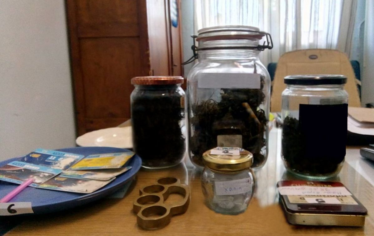 - οικιακά σκεύη και πέντε (5) τηλεκάρτες με υπολείμματα ηρωίνης και