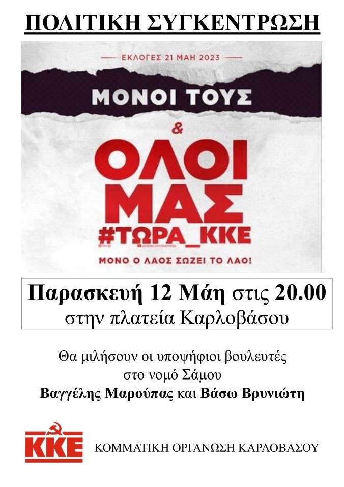 Μετά λοιπόν τις πρόσφατες συγκεντρώσεις στα μεγάλα χωριά Πύργο (6/5)και Κοντακέικα (7/5), σειρά έχουν ομιλίες στους Μυτιληνιούς (Τετάρτη 10/5 στις 19.00 στην πλατεία), Καρλόβασι (Παρασκευή 12/5 στις 20.00 στην πλατεία), Μαραθόκαμπο (Σάββατο 13/5 στις 19.00 στην πλατεία Αγίου Αντωνίου), Χώρα (Σάββατο 13/5 στις 19.00 στο καφενείο του Στέλιου Γιαννακή) και Παγώνδα (14/5 στις 19.00 στο καφενείο του Κουλούρη).