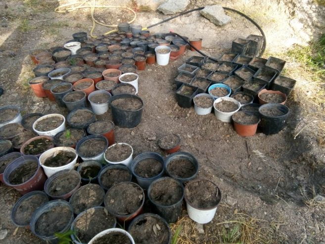 • 6 δενδρύλλια κάνναβης, ύψους από 3,5 έως 9,7 εκατοστά, τοποθετημένα σε γλάστρες