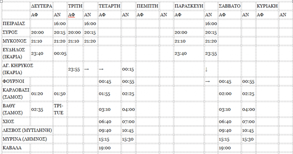 ΠΕΙΡΑΙΑΣ -ΣΥΡΟΣ -ΜΥΚΟΝΟΣ – ΕΥΔΗΛΟΣ – ΑΓΙΟΣ ΚΗΡΥΚΟΣ – ΦΟΥΡΝΟΙ – ΚΑΡΛΟΒΑΣΙ – ΒΑΘΥ – ΧΙΟΣ – ΜΥΤΙΛΗΝΗ – ΛΗΜΝΟΣ – ΚΑΒΑΛΑ