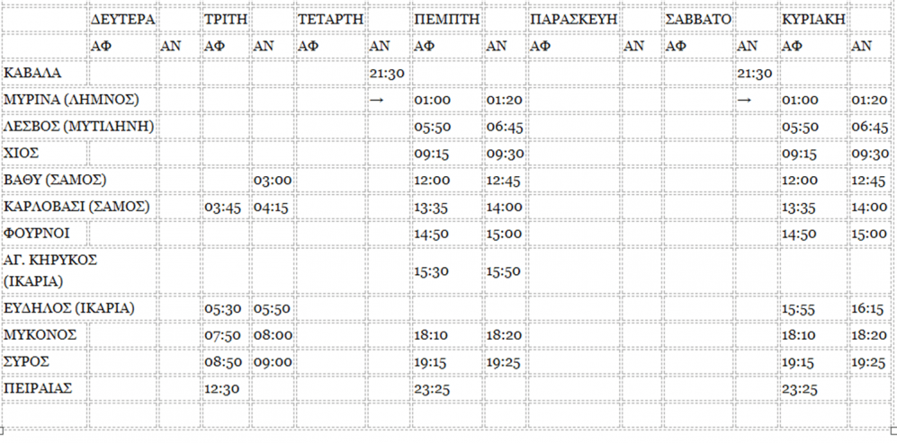 ΚΑΒΑΛΑ – ΛΗΜΝΟΣ – ΜΥΤΙΛΗΝΗ – ΧΙΟΣ – ΒΑΘΥ – ΚΑΡΛΟΒΑΣΙ – ΦΟΥΡΝΟΙ – ΑΓΙΟΣ ΚΗΡΥΚΟΣ – ΕΥΔΗΛΟΣ – ΜΥΚΟΝΟΣ – ΣΥΡΟΣ – ΠΕΙΡΑΙΑΣ