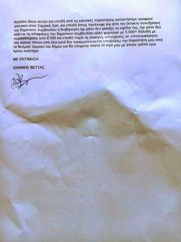 Κατόπιν όλων αυτών και επειδή από τις εικονικές παραιτήσεις καταντήσαμε γραφικοί απέναντι στον Σαμιακό Λαό ,και επειδή όπως προέκυψε και από την έκτακτη συνεδρίαση του δημοτικού συμβουλίου η Κυβέρνηση όχι μόνο δεν αλλάζει τα σχέδια της, όχι μόνο δεν σέβεται τις αποφάσεις του δημοτικού συμβουλίου αλλά φορτώνει με 5.000+ δηλαδή με περισσότερους από 8.000 και επειδή παρά τις συνεχείς υποσχέσεις σε αποσυμφόρηση του νησιού τίποτα από όλα αυτά δεν πραγματοποιείται υποβάλλω την παραίτηση μου από το θεσμικό ‘όργανο του δήμου και θα υπηρετώ πάντα το νησί μου με όποιο τρόπο εγώ κρίνω καλύτερο