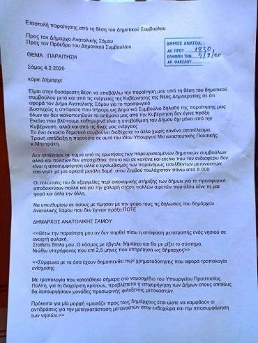 Είμαι στην δυσάρεστη θέση να υποβάλλω την παραίτηση μου από τη θέση του δημοτικού συμβούλου μετά και από τις ενέργειες της Κυβέρνησης της Νέας Δημοκρατίας σε ότι αφορά τον Δήμο Ανατολικής Σάμου για το προσφυγικό