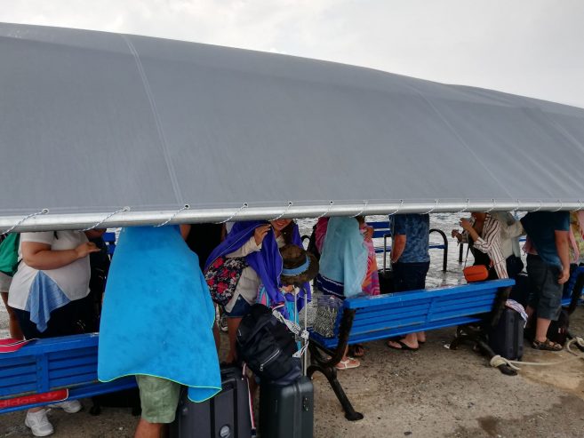 Το ένα και μοναδικό στέγαστρο που υπάρχει στο λιμάνι Πυθαγόρειου, δυστυχώς, δεν ήταν αρκετό να χωρέσει όλους τους επισκέπτες, λόγω ότι είναι σχετικά μικρό, με αποτέλεσμα οι μισοί από αυτούς να βρίσκονται κάτω από την καλοκαιρινή βροχή, ευχόμενοι να επιβιβαστούν το συντομότερο δυνατόν στο πλοιάριο με προορισμό το Κουσάντασι.
