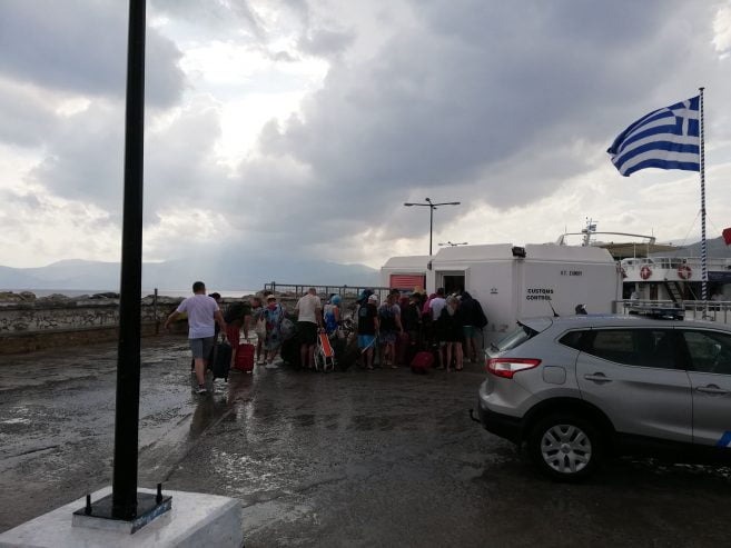 Η απογευματινή μπόρα που ξέσπασε το απόγευμα της Κυριακής στο Πυθαγόρειο, βρήκε τους τούρκους επισκέπτες τη στιγμή που περνούσαν τον διαβατηριακό έλεγχο.