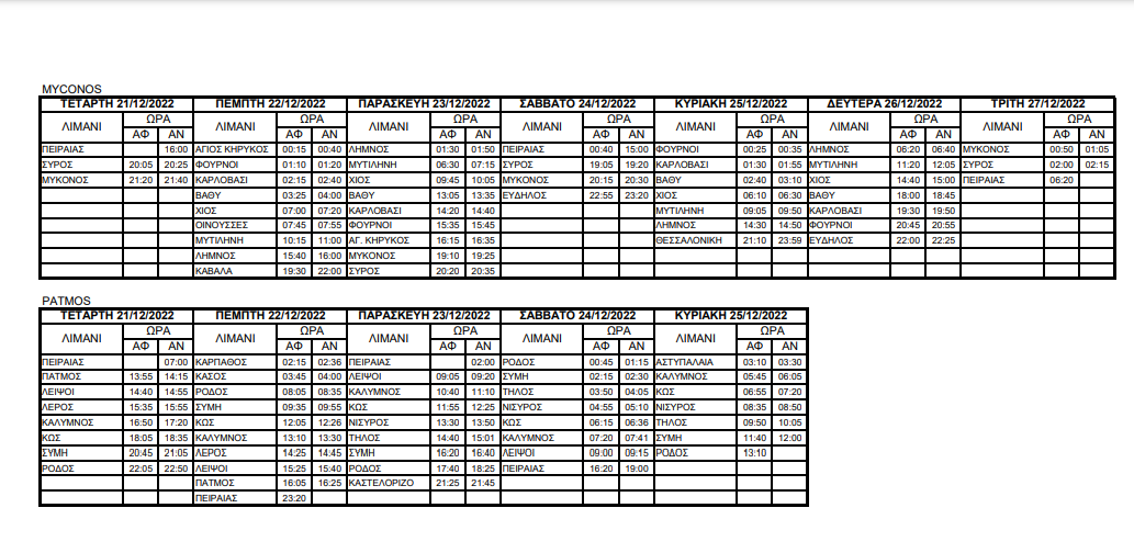 • Τετάρτη 21/12/22: το πλοίο θα αναχωρήσει στις 16:00, επομένως τα δρομολόγια του θα διαμορφωθούν σύμφωνα τον πίνακα που θα δείτε εδώ και κατόπιν ως εγκεκριμένα.