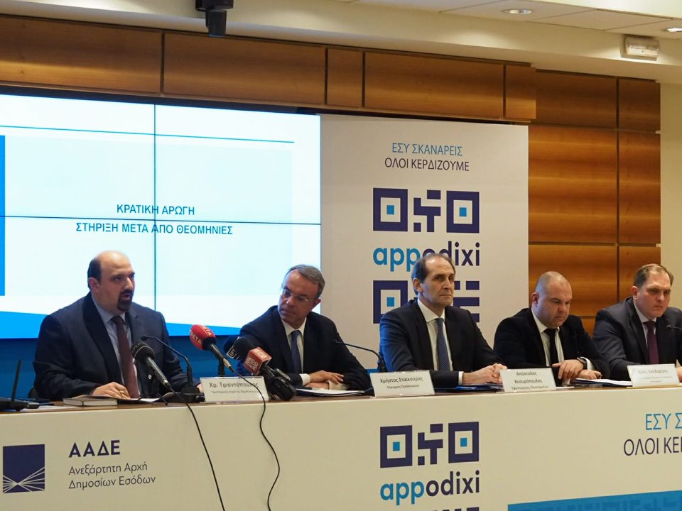 Συνέντευξη τύπου έδωσαν τη Δευτέρα 20 Φεβρουαρίου 2023 ο Υπουργός Οικονομικών κ. Χρήστος Σταϊκούρας, ο Υφυπουργός Οικονομικών κ. Απόστολος Βεσυρόπουλος, ο Υφυπουργός παρά τω Πρωθυπουργώ, αρμόδιος για θέματα Κρατικής Αρωγής και Αποκατάστασης από Φυσικές Καταστροφές, κ. Χρήστος Τριαντόπουλος, ο Γενικός Γραμματέας Οικονομικής Πολιτικής του Υπουργείου Οικονομικών κ. Νικόλαος Κουλοχέρης και ο Διοικητής της Ανεξάρτητης Αρχής Δημοσίων Εσόδων (ΑΑΔΕ) κ. Γιώργος Πιτσιλής, με θέμα τον απολογισμό των μέτρων και δράσεων που έχουν υλοποιηθεί μέχρι σήμερα στο πεδίο της Κρατικής Αρωγής προς επιχειρήσεις που έχουν πληγεί από φυσικές καταστροφές.
