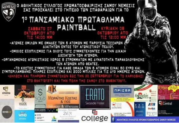 Το πρώτο Πανσαμιακό Πρωτάθλημα Paintball στο νησί της Σάμου είναι γεγονός! O Αθλητικός Σύλλογος Χρωματοσφαίρισης Σάμου Νέμεσις σας ανακοινώνει την διεξαγωγή του, το οποίο και θα πραγματοποιηθεί το Σάββατο 07 Οκτωβρίου από τις 14:00μμ και την Κυριακή 08 Οκτωβρίου από της 12:00 το μεσημέρι.