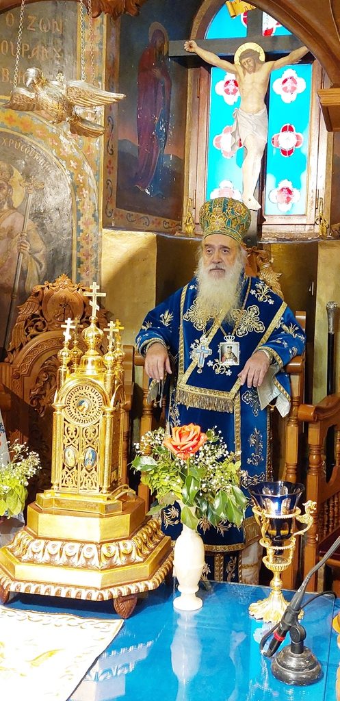 Προέστη δε της Λιτανεύσεως της Ιεράς Εικόνος στη πόλη των Καρλοβασίων παρουσία των Αρχών της πόλεως και πλήθους λαού. Συγκινητική υπήρξε η Δέησις έμπροσθεν του Εκκλησιαστικού Γηροκομείου “Ευγηρίας Πρόνοια” της Ιεράς Μητροπόλεώς μας.