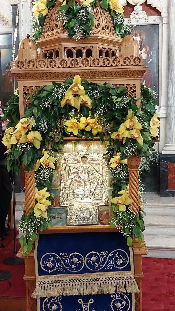 Παρέστησαν οι Πολιτικές και Στρατιωτικές Αρχές του Νησιού μας. Δυστυχώς λόγω καταρρακτώδους βροχής δεν πραγματοποιήθηκε η Λιτάνευση της Ιεράς Εικόνος του Αγίου μας.