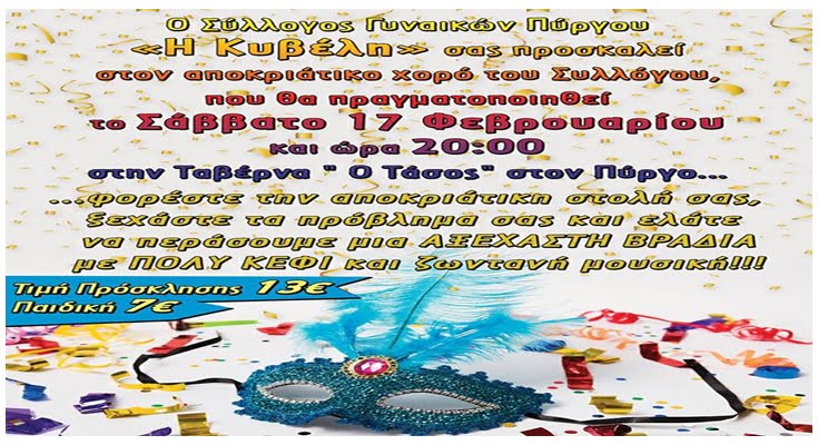 Ο Σύλλογος Γυναικών Πύργου Η Κυβελη σας προσκαλεί στον αποκριάτικο χορό του Συλλόγου που θα πραγματοποιηθεί το Σάββατο 17 Φεβρουαρίου και ώρα 20:00 στην Ταβέρνα ” Ο Τάσος” στον Πύργο.