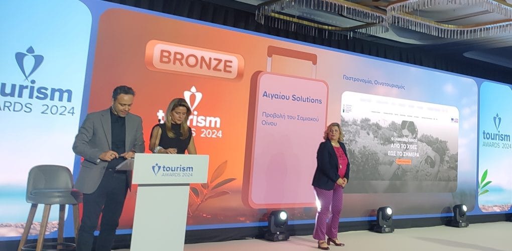 Στα βραβεία Tourism Awards που έλαβαν χώρα στις 15.04.24 στο Grand Hayat στην Αθήνα 2024 υπό την αιγίδα του Υπουργείου Τουρισμού, του Ελληνικού Οργανισμού Τουρισμού (ΕΟΤ) και του Συνδέσμου Ελληνικών Τουριστικών Επιχειρήσεων (ΣΕΤΕ) απονεμήθηκε το χάλκινο βραβείο στην κατηγορία Γαστρονομία – Οινοτουρισμός στο έργο με τίτλο: «Ψηφιακές Διαδρομές Σαμιακού Οίνου: Το κρασί σαν μέσο προβολής και προώθησης του πολιτιστικού αποθέματος της Σάμου», που υλοποιήθηκε με δικαιούχο την Περιφέρεια Βορείου Αιγαίου – ΠΕ Σάμου και χρηματοδοτήθηκε από το ΕΣΠΑ – ΕΠ Βόρειο Αιγαίο 2014 -2020 με ανάδοχο την εταιρία Αιγαίου Solutions Α.Ε.