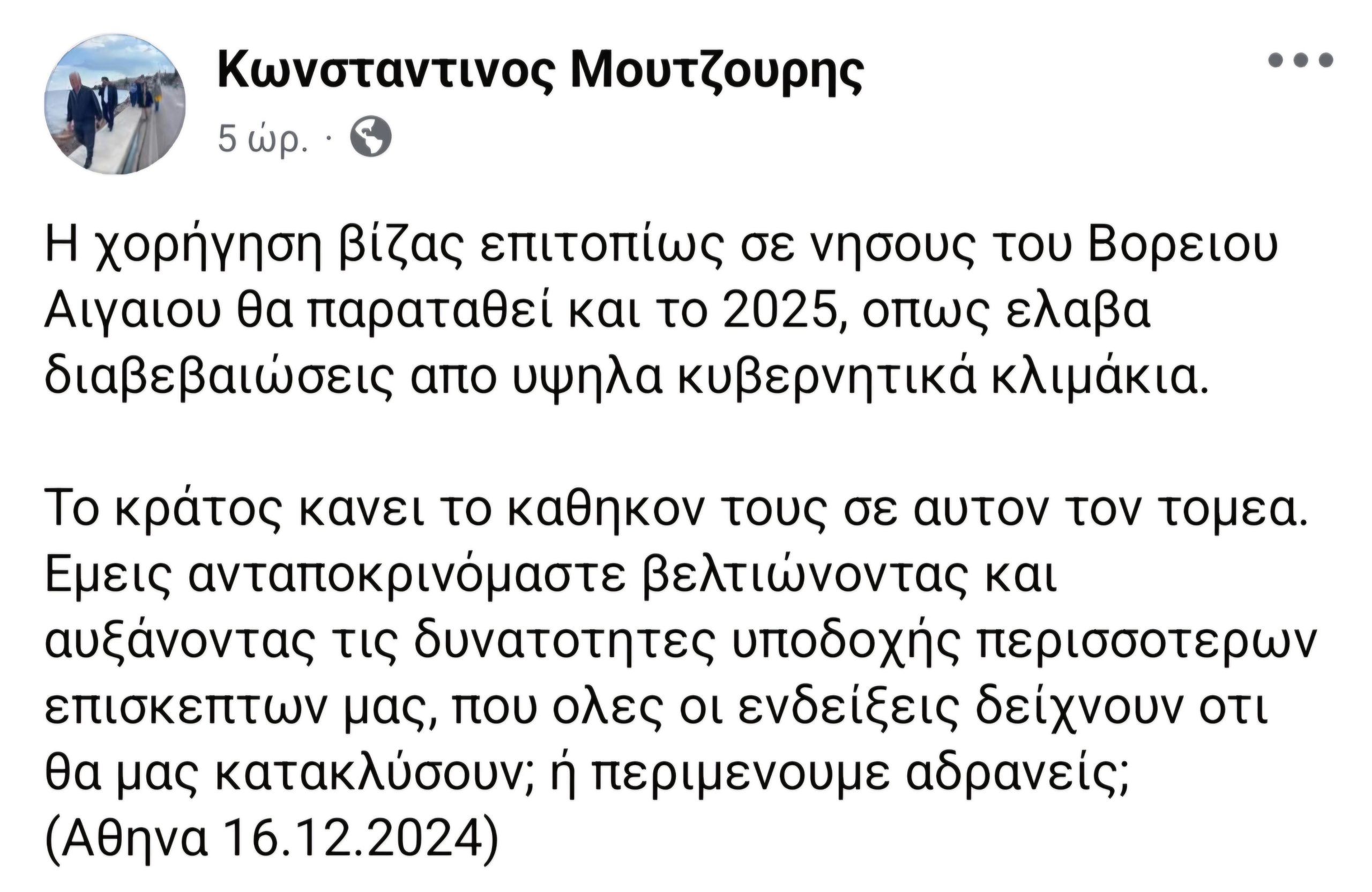Ο κ. Κώστας Μουτζούρης, μέσω ανάρτησής του στα κοινωνικά δίκτυα, ανέφερε πως το κράτος έχει επιτελέσει την υποχρέωσή του στον τομέα της παράτασης της βίζας, επισημαίνοντας ωστόσο την ανάγκη για καλύτερη προετοιμασία των νησιών ώστε να ανταποκριθούν στην πιθανή αυξημένη προσέλευση επισκεπτών.
