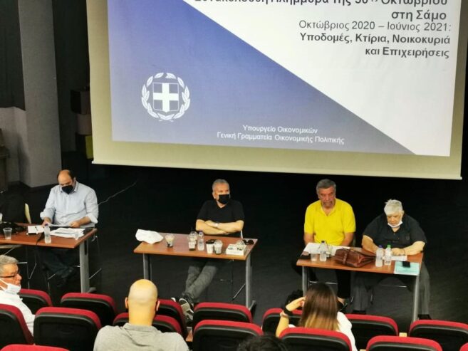 Σύσκεψη στην Περιφερειακή ενότητα Σάμου με τον Γενικό Γραμματέα Οικονομικών, κ. Χ. Τριαντόπουλο, τον Αντιπεριφερειάρχη Σάμου, κ. Β. Πανουράκη, τον τοπικό συντονιστή, κ. Θ. Θαλασσινό, τον Δήμαρχο Ανατολικής Σάμου, κ. Γ. Στάντζο, και τον Δήμαρχο Δυτικής Σάμου, κ. Α. Λυμπέρη.