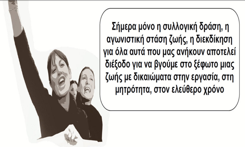 Σήμερα μόνο η συλλογική δράση, η αγωνιστική στάση ζωής, η διεκδίκησηγια όλα αυτά που μας ανήκουν αποτελεί διέξοδο για να βγούμε στο ξέφωτο μιας ζωής με δικαιώματα στην εργασία, στη μητρότητα, στον ελεύθερο χρόνο.